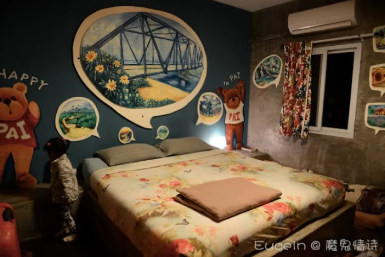 我们入住是PAI景点主题的房间,里头画了不少PAI著名景色,多可爱啊!整体风格采用了泰国人擅长的色彩美学,是的!我们所认识的泰国人都非常热爱色彩。这里的主人(老板)还特地进来友好打招呼,并感谢我们选择入住他们的度假屋。