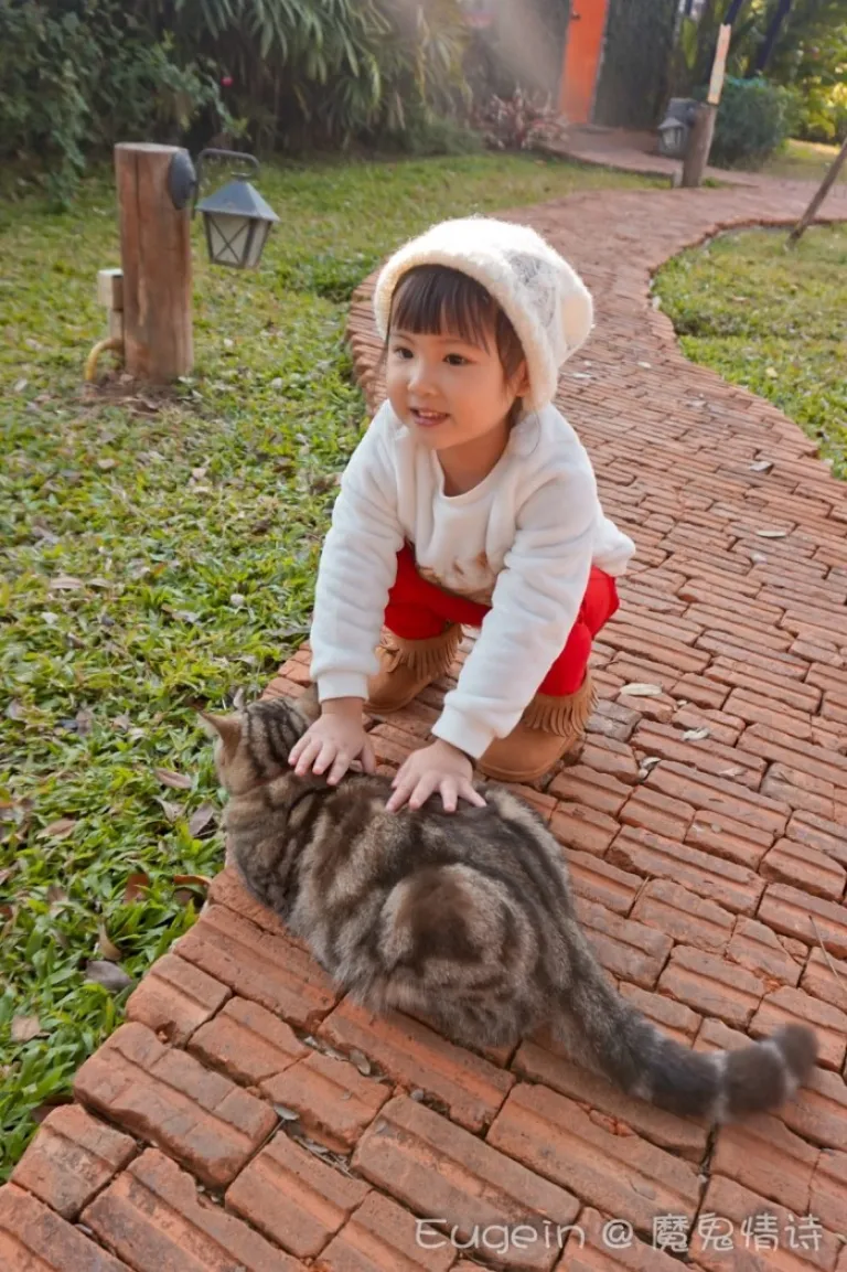 平时我是不太让丫丫碰猫,我太知道丫丫过分热情脾性,遇上冷漠不爱被打扰的猫咪随时可能出现攻击的意外。我观察到Kirina Retro House里的大猫咪性情算温驯,才放心让他们玩耍。结果我担心的事情最后还是发生, cookie随后跑到草丛,丫丫追着它拼命说回来回来!甚至扳开草丛急着想将它抱出来,cookie出于自卫伸出猫爪抓了丫丫手背一下。