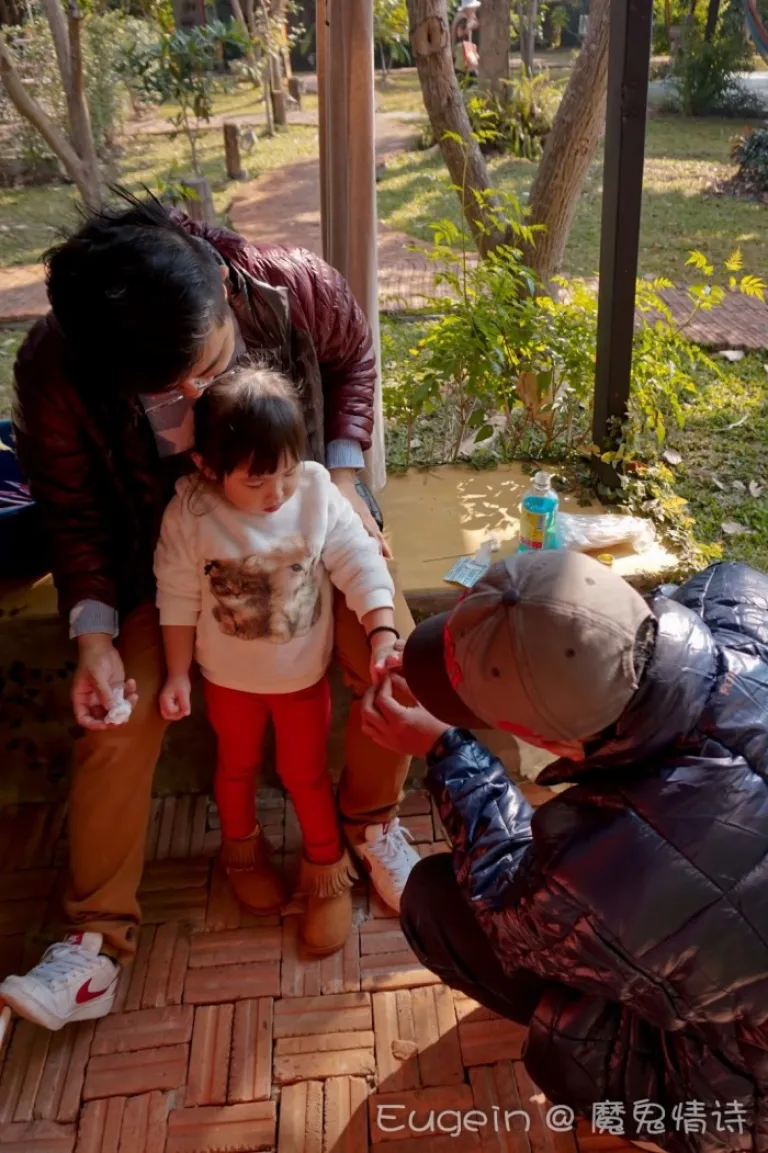 丫丫离开草丛扁着嘴跑回来找我们,问她到底给cookie抓伤哪儿?她马上哇一声哭了出来,紧接着员工提着急救箱三秒三出现在我们面前。原来丫丫在户外逗猫咪期间,员工会在一定的距离看管与照顾住客的安全,所以丫丫被抓一事完全被看在他们眼里。