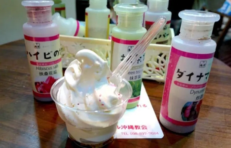 오키나와에는 유명한 아이스크림이 많지만 그 중에서도 소금 아이스크림은 꼭 먹어볼 것을 추천한다. 유키시오 소금 제염소에서 파는 이 아이스크림은 먹는 방식이 특이한데 소프트아이스크림에 각종 소금을 쳐서 먹는 방식이다. 히비스커스, 코코아, 와사비, 그린티 등 독특한 소금을 뿌려 먹을 수 있다. 일본어로 ‘유키’는 눈이라는 뜻이고 ‘시오’는 소금이라는 뜻으로 유키시오는 ‘눈소금’이라고 번역할 수 있다. 유키시오 소금은 바닷물을 끌어다 증발시켜 만드는 것이 아니라 암반에 고여있는 해수에다 강한 열을 분사시켜 소금을 만들어 간수 성분이 많이 포함되어 있으며 미네랄 등 각종 영양소가 풍부하다.