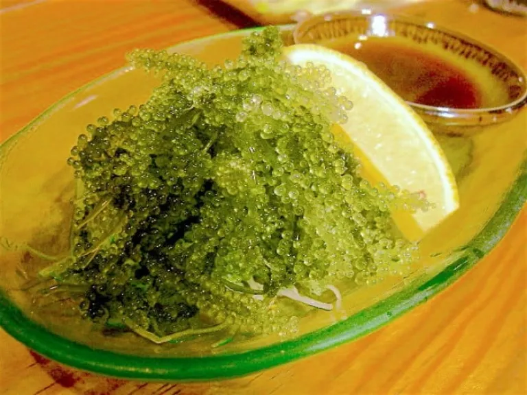 ‘바다포도’ 라고 직역되는 우미부도는 오키나와 지역에서 자라는 특산물이며 녹색 캐비어라고도 일컬어 진다. 작은 녹색 구슬을 엮은 듯한 모양새로 톡톡 터지는 식감이 매력적이며 간장이나 식초에 찍어 맥주 안주로 먹거나 회와 같이 밥에 올려 먹을 수 있다. 우미부도는 미네랄과 식이섬유가 풍부하며 칼로리가 낮아 건강에도 매우 좋은 오키나와 먹거리다.