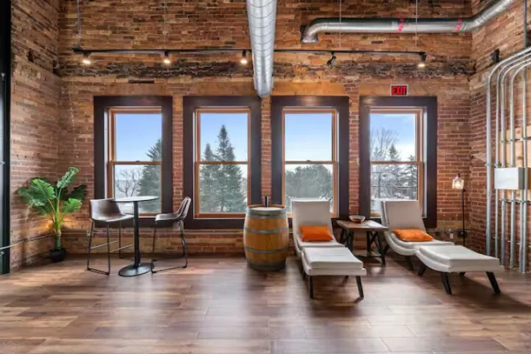 Set in a private, secure building at the intersection of Superior Street and Lake Avenue, this Airbnb in Duluth is perfectly located for enjoying both the city and the lake. High-end features include heated floors, a steam shower, gas fireplace, and entertainment options like shuffleboard and foosball. With three bedrooms and a large dining space, it’s well-suited for group stays. Just a short walk to Canal Park and Lakewalk, the home offers the luxury of seclusion while keeping Duluth’s best attractions within easy reach.