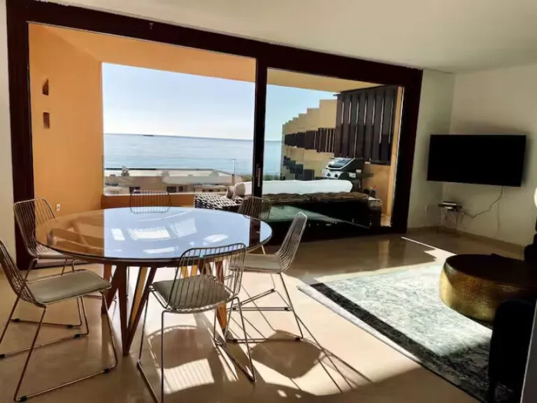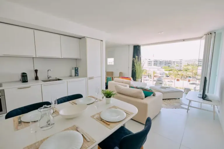 Set in the heart of upscale Marina Botafoch, this chic airbnb stay in Ibiza gives you sweeping views of Ibiza’s historic Dalt Vila while placing you next to the island’s most refined entertainment. Inside, you’ll find two plush king bedrooms, a giant sofa, a modern kitchen, and a sun soaked terrace for late night drinks or morning espressos. With access to a communal pool and Ibiza’s best clubs a stroll away, it’s the perfect home base for style focused travelers.