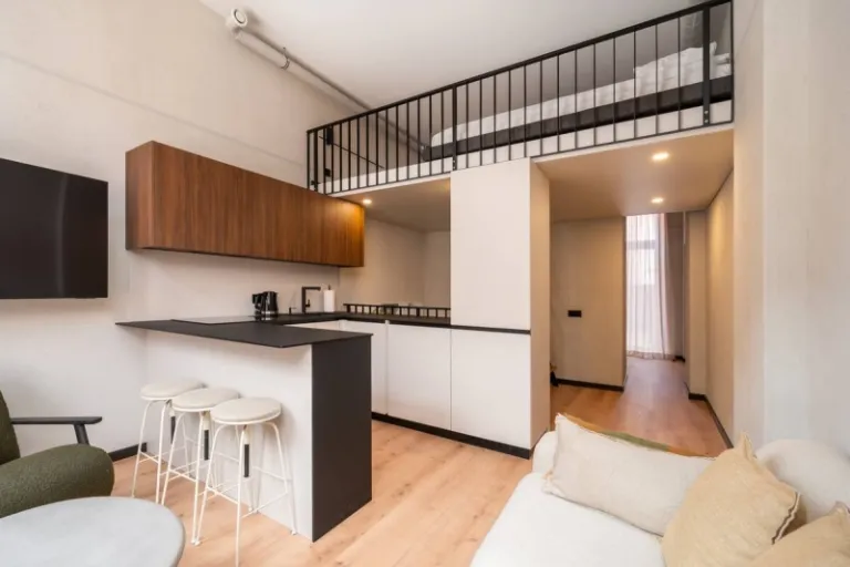 Hallo Loft brings sleek modernity to the heart of Riga’s vibrant center. Featuring a mezzanine sleeping space, a separate bedroom, and a private terrace, this urban oasis offers both comfort and functionality. The space includes a dedicated workspace, fully equipped kitchen, rain shower bathroom, and in unit laundry. Whether you’re in town for work or leisure, this well designed loft provides an ideal base, just minutes from cafés, shops, and the city’s top fitness centers.