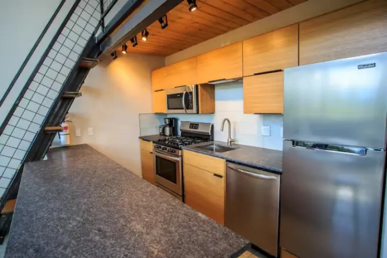 With two stories of thoughtfully designed space, this home boasts an expansive kitchen with a massive island, a cozy wood fireplace, and vaulted ceilings. The upstairs living area connects to two balconies, while the downstairs features two comfortable bedrooms. A designated workspace and entertainment nook make this home perfect for work and play.