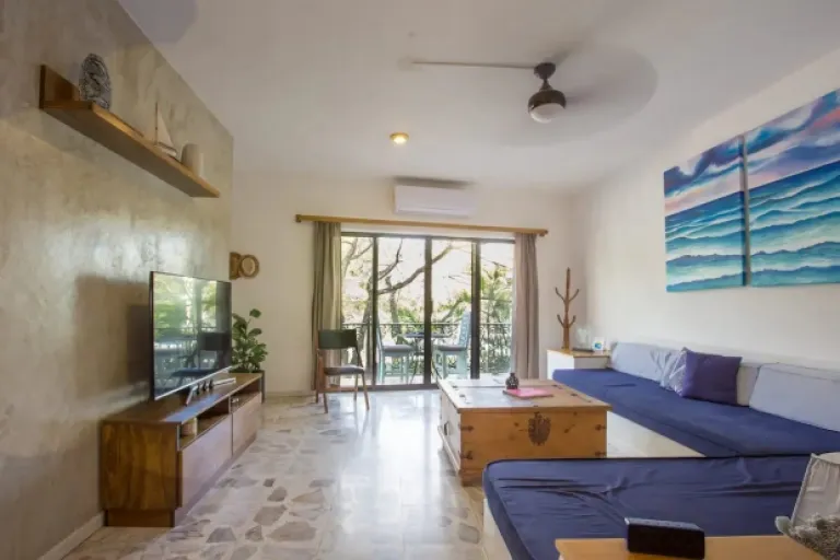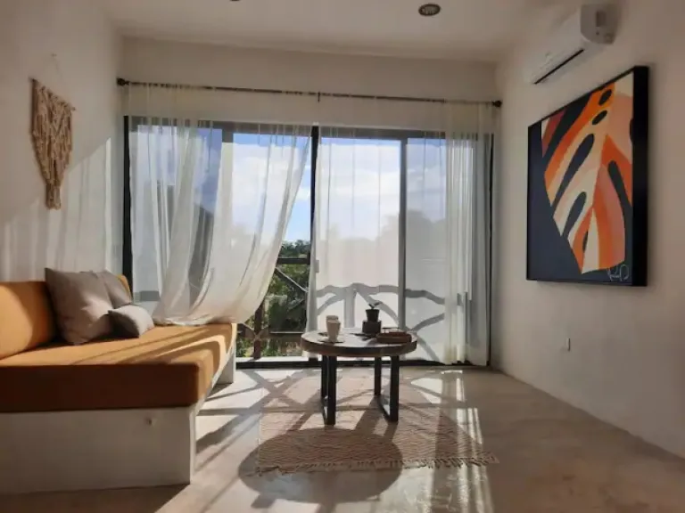 This apartment is perfect for a small family. Located just two blocks from the Cozumel International Airport, beach and restaurants, it offers a comfy bedroom with AC, a living room with a sofa bed and workspace, a kitchen, a bathroom, and a relaxing patio. This charming spot is ideal for a laid-back island escape.