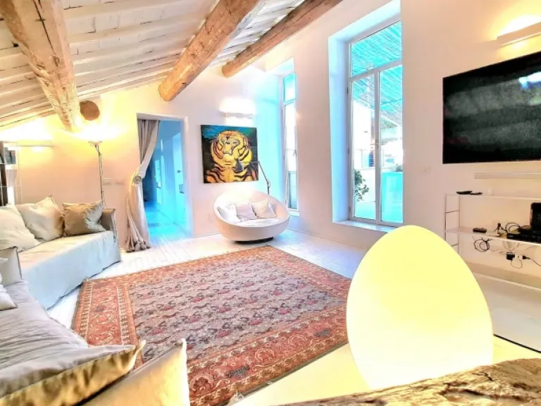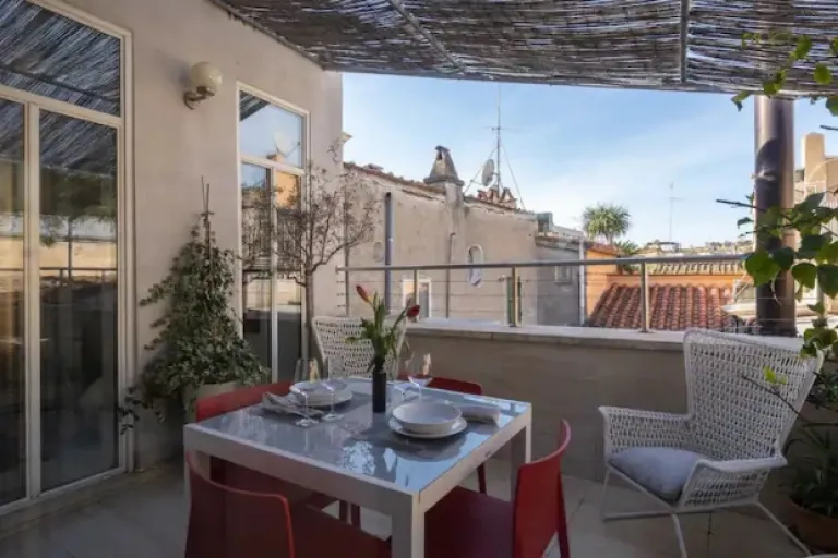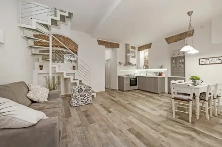 This unique penthouse features a lovely terrace with views of Rome’s rooftops. This Airbnb in Rome has charming wooden beams, stylish finishes, and ample space. Moreover, the kitchen, made of Travertino marble, is large and equipped for entertaining.