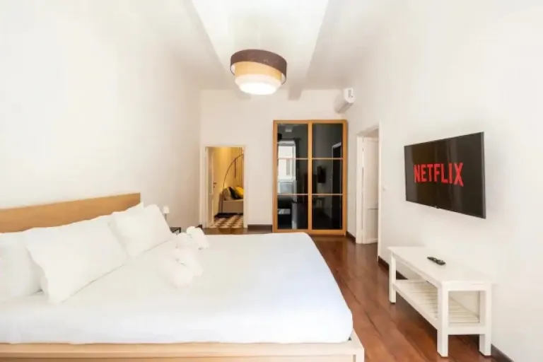 Additionally, the spacious living room includes a sofa bed, dining table, and a TV with Netflix and Amazon Video. The kitchen is fully equipped, and there are two spacious bathrooms. The apartment’s central location allows easy access to major attractions, shopping, and dining.