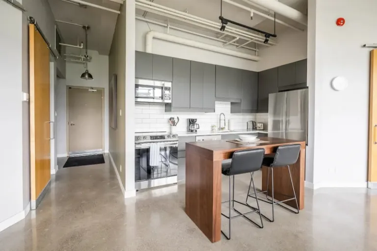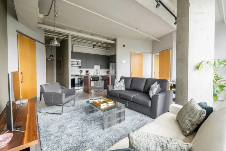 This isn’t your average one-bedroom! This industrial loft boasts soaring 12-foot ceilings and polished concrete floors, giving it a super modern vibe. Plus, there’s tons of natural light pouring in from the large windows. Relax on the comfy sofas (one folds out to a bed!), catch a show on the big-screen TV, or gather around the dining table for a family feast. The kitchen’s got an island with seating, perfect for whipping up snacks or meals. The master bedroom has a king-size bed for ultimate relaxation, and there’s even a washer and dryer in the unit. Talk about convenience!