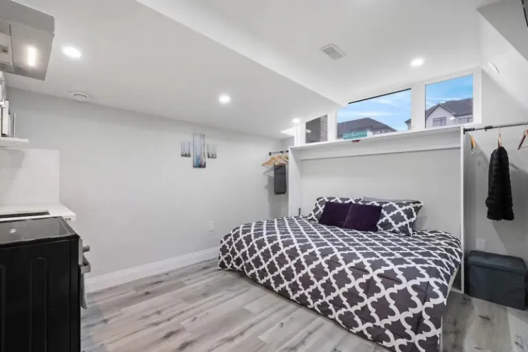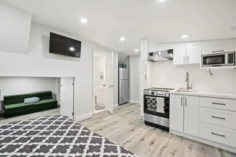 Looking for something a little different than the usual ? This Zen studio apartment might be for you! This compact space offers a queen bed that folds up to create extra space, and a chic atmosphere. There’s a table that converts into a workspace or kitchenette, a comfy couch, and a small bathroom for your convenience. Plus, there’s shared laundry and high-speed internet to keep you connected. This modern space is perfect for a unique and stylish stay.