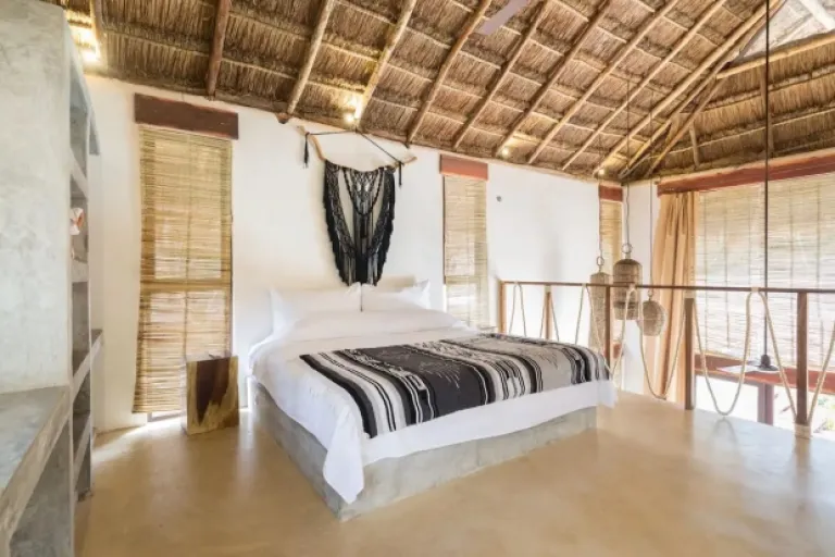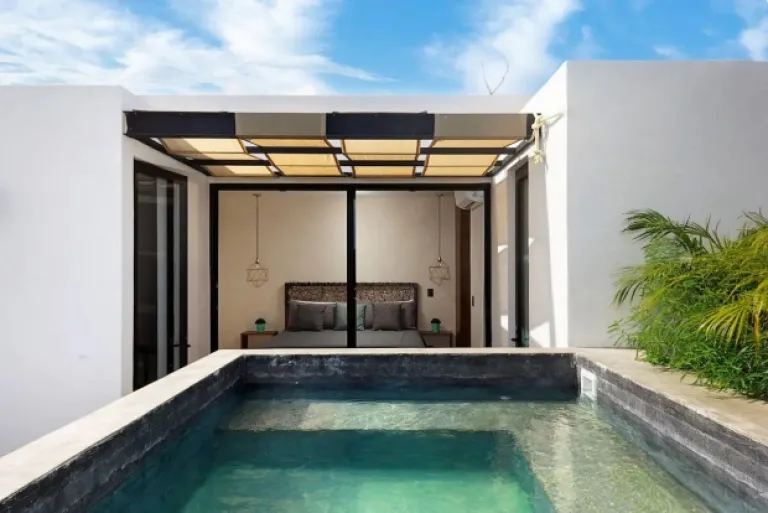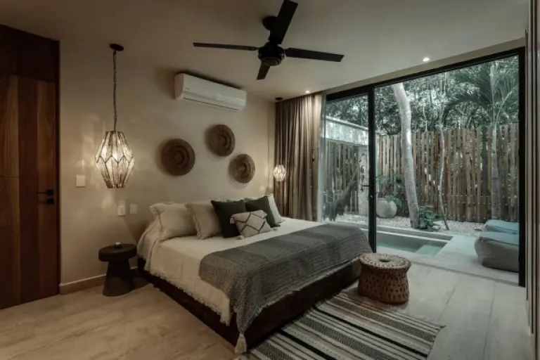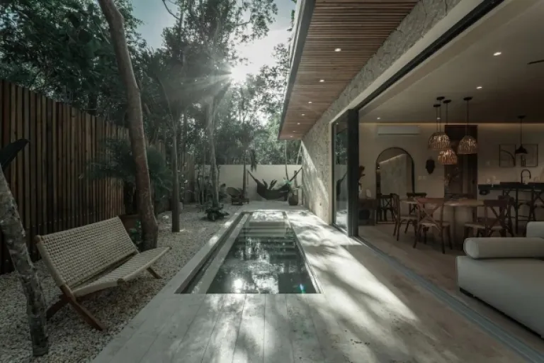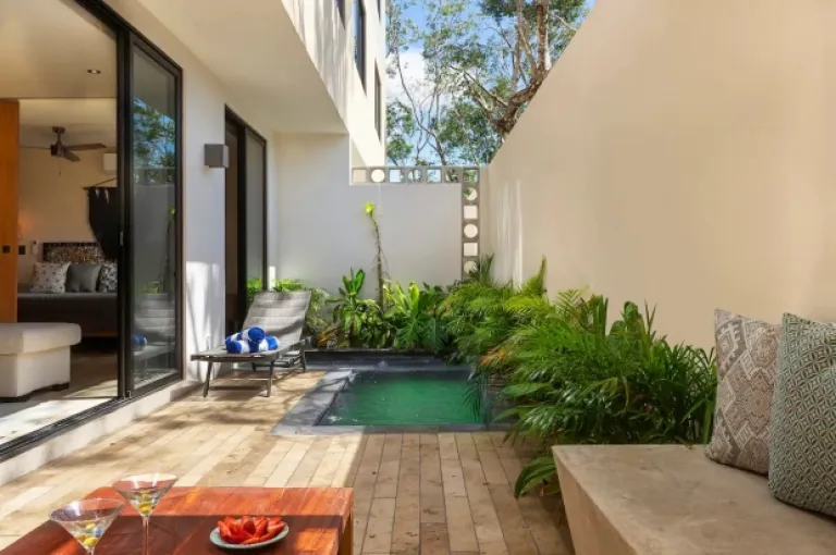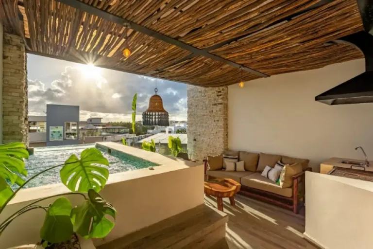 Picture this: turquoise waters, lush jungle, and a cool Mayan-style bungalow – that’s Ikal Ha! This unique spot is perfect for families who want to experience the real Tulum. It’s got a sparkling pool, comfy living areas, and even a private outdoor bathtub! Plus, the decor is all handmade by Mayan artisans, adding a touch of local magic.