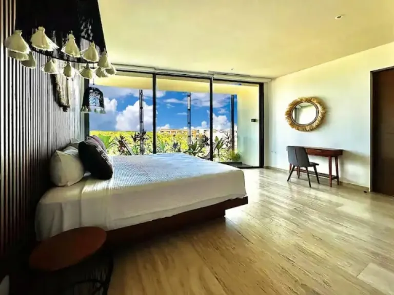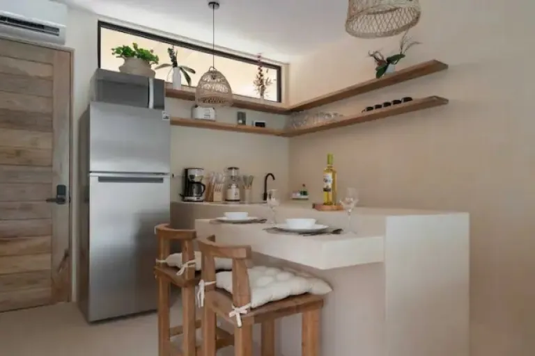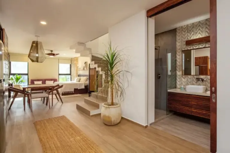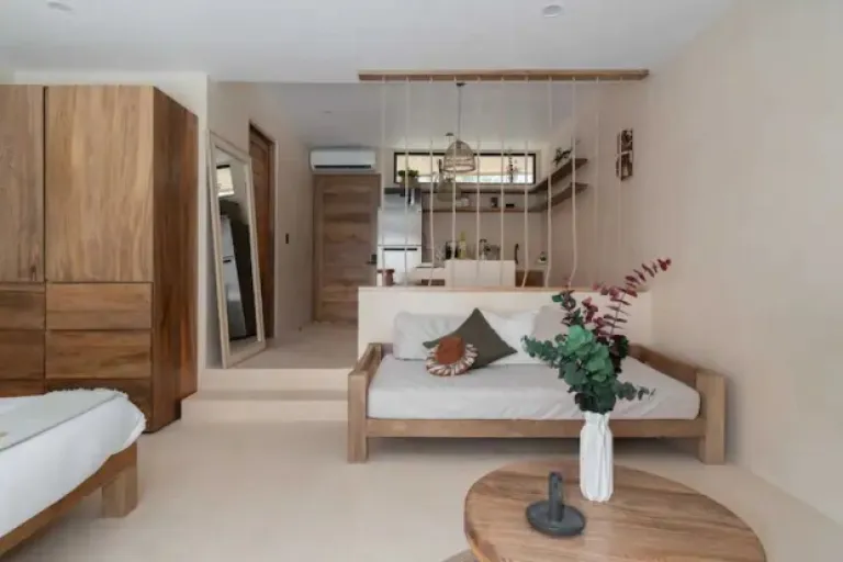 This is one of the Airbnbs in Tulum that is all about convenience and relaxation. It’s located in La Veleta, close to the beach, town, and cenotes (natural swimming holes). Plus, it has a cozy private plunge pool on the balcony, perfect for cooling off after a day of exploring. Need to stay connected? No problem – the Wi-Fi is super fast! They can even help you arrange extras like in-house massages, a private chef, or airport transfers.