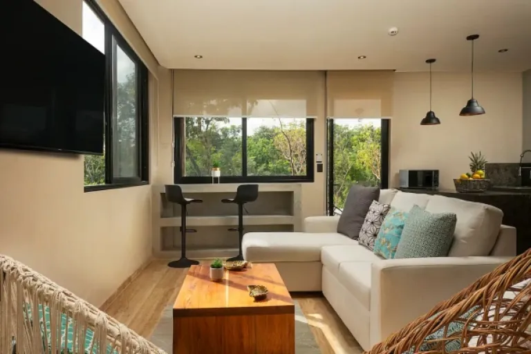 This luxurious 2-bedroom apartment is ideal for families who want their own private space. It has a sparkling pool, a relaxing jacuzzi, and even a traditional Mayan steam bath! The apartment is spacious and stylish, with a fully equipped kitchen and a private terrace with a BBQ. Plus, the location in La Veleta, Tulum’s trendiest neighborhood, can’t be beat!