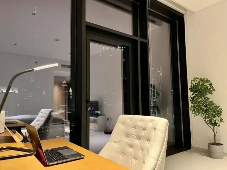 Calling all tech lovers! This luxurious apartment boasts a projector, an amazing sound system, and a fully-equipped kitchen for the ultimate movie night in. Oh, and did we mention the balcony with stunning views of the Burj Khalifa? Located in the heart of Business Bay, this spot is close to shops and restaurants, making it perfect for exploring. One of the with the stunning city views.