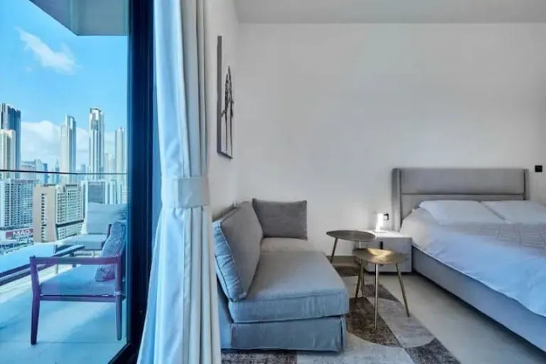 Another budget-friendly option, this BinGhatti Canal Tower studio offers all the bells and whistles you need for a luxurious stay. Think modern furnishings, high-speed wifi, and amazing views of the Burj Khalifa. There’s even a pool and gym in the building, plus restaurants and shops just a short walk away.
