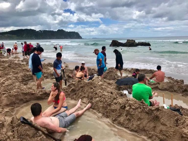 The Hot Water Beach has got to be the coolest beach I’ve ever been to, where people bring spades there to dig in the sand. Upon doing so, water as hot as 64 degrees will surface and beach goers enjoy sitting in these warm (or hot) puddles. This is possible because of its geothermal location, and it was so fascinating.