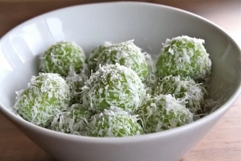 Ondeh ondeh are green rice balls coated in coconut shavings filled with gula melaka (palm sugar) that bursts in your mouth.