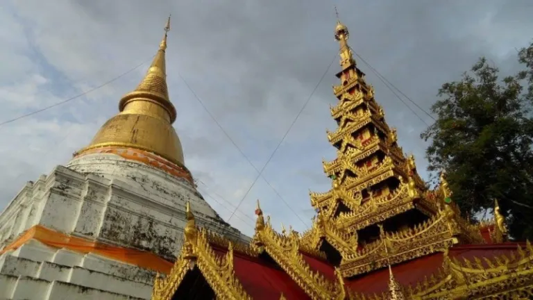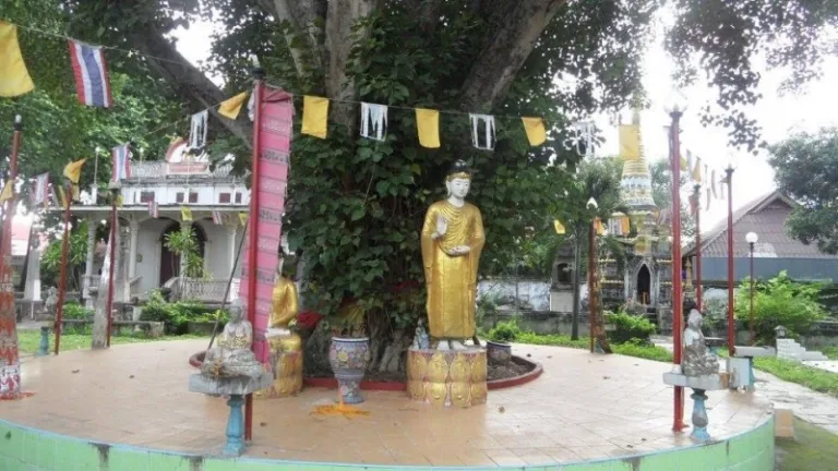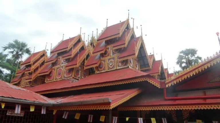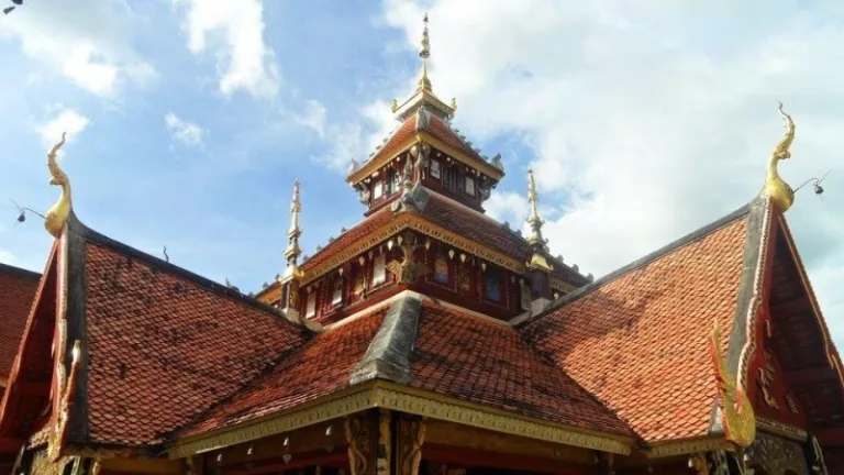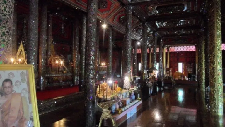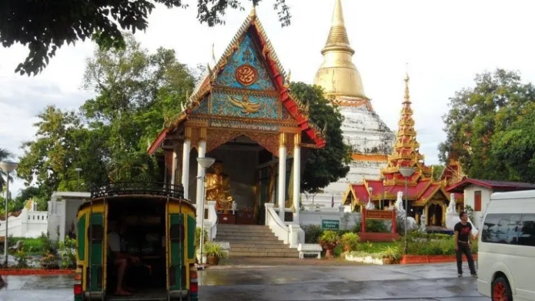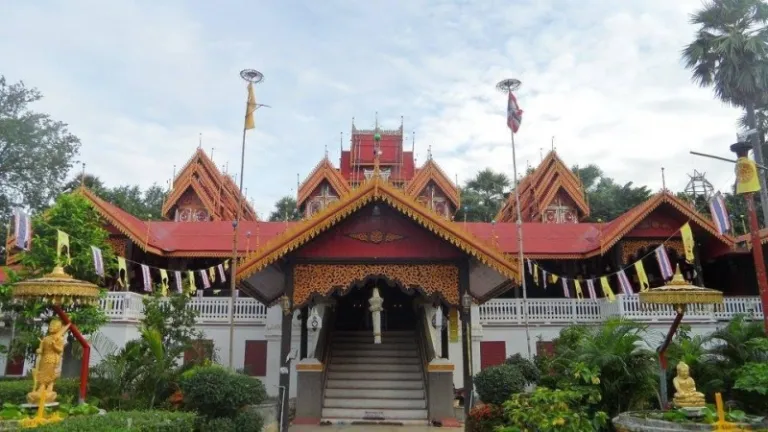 Wat Sri Chum is surrounded by revered Bodhi trees and high walls. Constructed by an affluent Burmese merchant in the late 1800s, the temple uses lots of teak wood in its designs. There are rich carvings inside the halls and many teak columns. An ornate gate stands at the entrance and there are statues of the Lord Buddha in various postures, mythical lions (as common at Burmese temples), a chedi that houses sacred relics, and other eye-catching features.