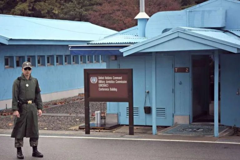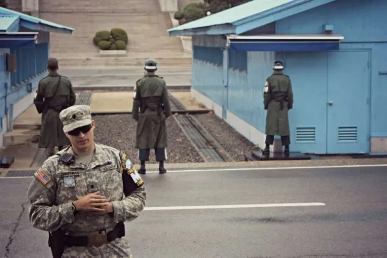 We were ushered to receive a briefing in Ballinger Hall which essentially was a slideshow that provided information on the history of Korean War and the present situation at the DMZ. After the presentation, we were escorted to finally view the central attraction of JSA, where the Freedom House on the South stands facing the North’s’ Panmungak grey building. In between the two buildings is a courtyard with a row of small blue buildings straddling the Military Demarcation Line (MDL). The MDL is surrounded by the Demilitarized Zone (DMZ) under the provisions of the Armistice Agreement signed in July 1953. The Line runs 155 miles and separates the South and the North, the boundaries of the DMZ are located 2km apart from the MDL.
