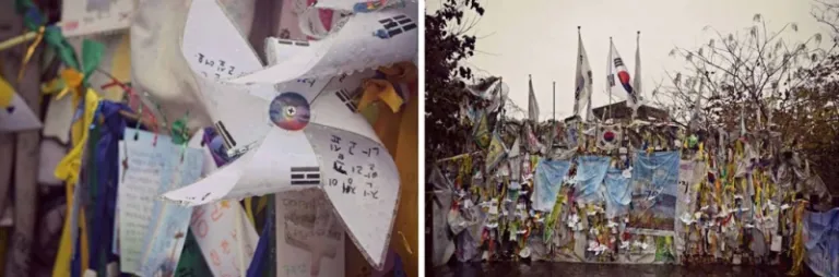 The bridge now serves as a place of remembrance for families who are separated – South Koreans tie bright colored ribbons covered in messages to the bridge – messages for their family members in the North, or in memorial of family members who died in the North.
