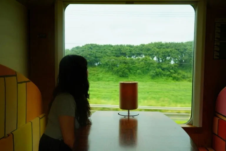 One of the most memorable rides was on the Resort Shirakami, a sightseeing train with panoramic windows that runs along the Gono Line between Aomori and Akita. The route hugs the coastline, passing through tunnels, forests, and cliffside views of the Sea of Japan. Inside, there were even live performances (we had a shamisen musician playing while the landscape rolled by).