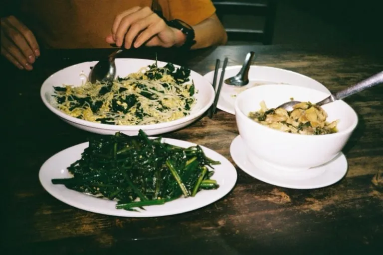 Stir-fried midin with belacan (right)