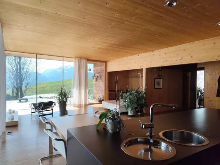 With sleek wooden architecture and wide glass fronts, this modern chalet offers a serene escape surrounded by alpine beauty. The open living area and three bedrooms create space for families or groups to relax and reconnect. From sunny terraces to scenic hiking trails just outside the door, every detail encourages outdoor living. Inside, minimalist design meets comfort, making this airbnb in Innsbruck perfect for both winter retreats and summer adventures.