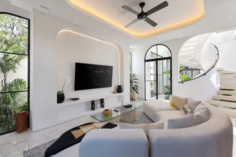 This is an exquisite private pool villa in Bali that is in fact one of the largest 3 bedroom villas in Canggu. The indoor architecture here is super luxurious and really pleasing to the eye. Another major attraction here is the 10-meter private pool, which is framed by lush foliage, spacious pool deck, sun loungers, a shaded daybed, and a cosy outdoor lounge area.