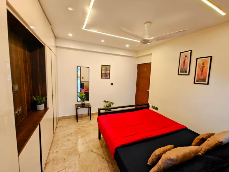 For those small groups of 3 or family of 3 who are looking for a comfy monthly-stay retreat, this Airbnb in Bengaluru is a fantastic option. You’ll also have access to fabulous facilities such as clubhouse, pool, gym, and gardens here. Furthermore, the entire indoors is beautifully designed in a modern and classy style.