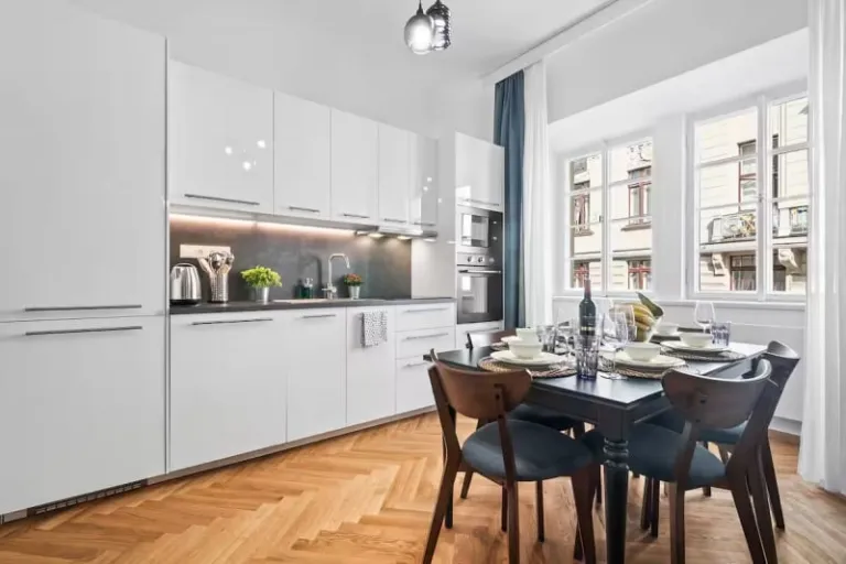 With sunlit rooms, high ceilings, and minimalist design, this 95-square-meter apartment is a haven of calm in the center of Prague. Floor-to-ceiling windows flood the space with light, while sleek wood floors and modern furnishings add warmth and elegance. Despite being just moments from Old Town’s liveliest streets, the apartment is wonderfully peaceful and a stylish sanctuary for couples or small groups seeking both comfort and quiet.
