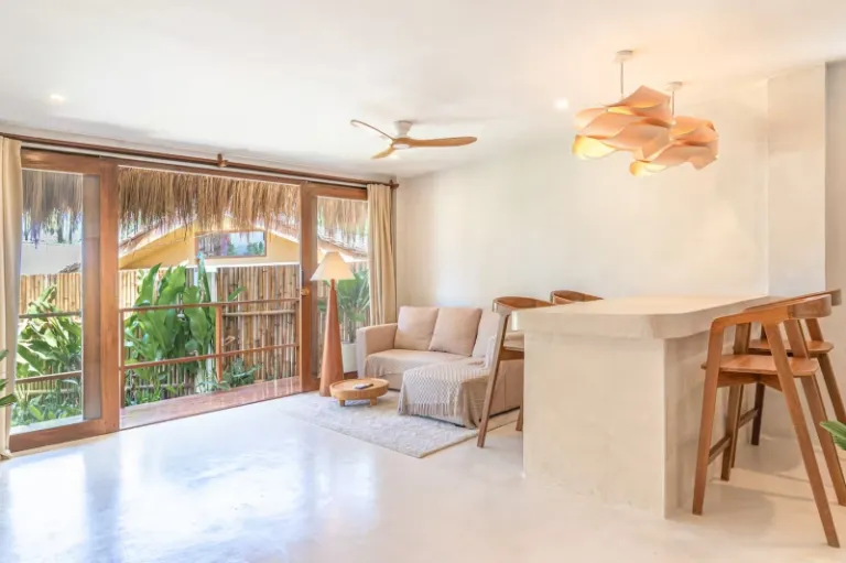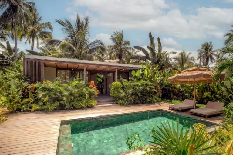 This is a gorgeous villa that’s nestled in a scenic spot that’s full of green fields and lovely coconut trees. Just the serene atmosphere and tranquility outdoors is bound to make you feel positive and happy here. The indoors can be described as minimalist yet comfy, filled with all standard amenities. Moreover, a short 5-minute ride will take you to famous restaurants, surf schools, and boutique shops.