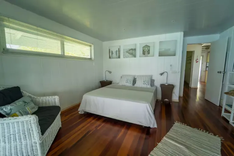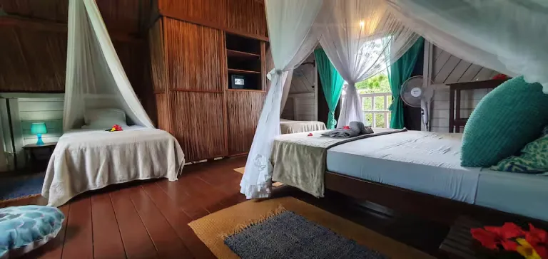 This private cabin is perfect for travellers wanting front-row sunset views over the lagoon. A spacious deck allows guests to unwind with evening drinks or morning coffee. Warm interiors make the stay comfortable and inviting. The location offers peace while remaining close to beaches. Ideal for a romantic tropical escape.