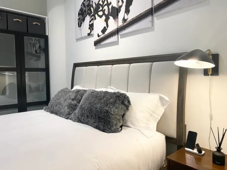 For families that love a white-themed home with beautiful interiors and classy decor, this is a fine pick. It is a single-bedroom Airbnb that’s visually uplifting with its serene beauty. In addition to this, families can enjoy views of the Broadway street as well. Moreover, they offer amenities like gym, pool, and bath tub.