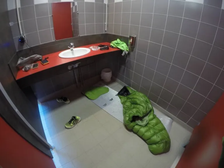 On one particular rainy night, Adrian ingeniously rested in a handicapped toilet. Who would have thought that a toilet could become a bedroom?