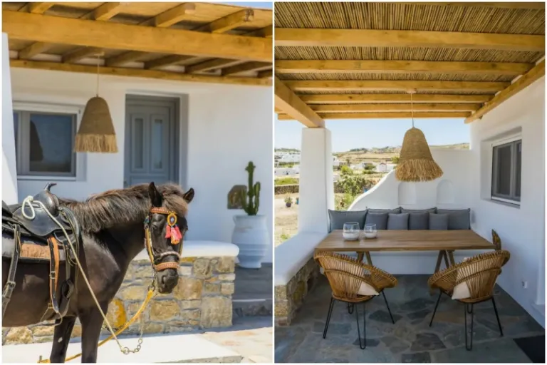 Although the farm setting may be a departure from the usual white-washed aesthetic of Mykonos Airbnbs, this charm-filled stone dwelling is no less enchanting. It’s found on a traditional farm where guests can rest and relax. Ride the friendly horse or donkey, then pop inside the private chapel for some quiet and contemplation.