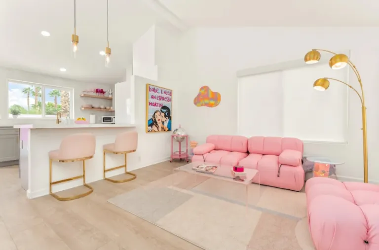 Decorated in various shades of pink, and hints of shiny furniture, this gorgeous abode is a study in Barbiecore perfection. Every section is an Instagrammable spot; from the living room with chic wall art and cloud-shaped sofas, to the bedrooms with cute mirrors and neon lights! Meanwhile, the backyard features a pool, sun loungers, and even a pink brick wall.