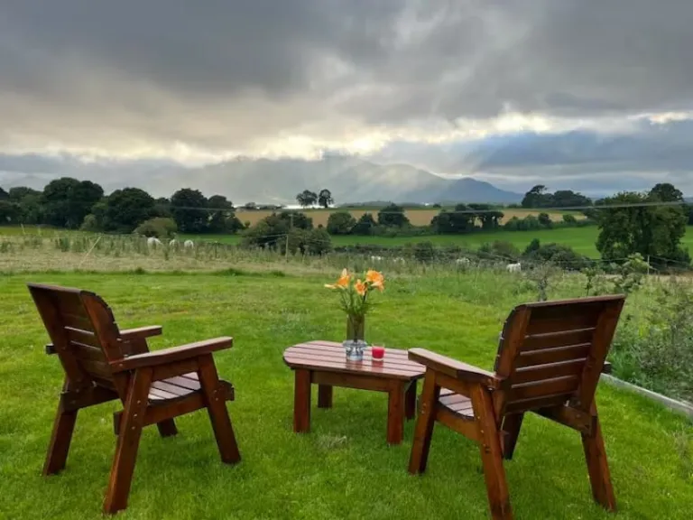 Set just 1.5 km from Killarney town yet surrounded by rural calm, this lodge suits couples seeking privacy without losing convenience. Indoors you’ll find a king-size bed, bespoke furniture and a full bathroom with power shower. The mini-kitchen includes a hob, toaster and Nespresso machine, with cookware and condiments provided for a simple night in. Evenings are best spent on the heated private patio with a sheltered BBQ and the sound of the river flowing nearby.