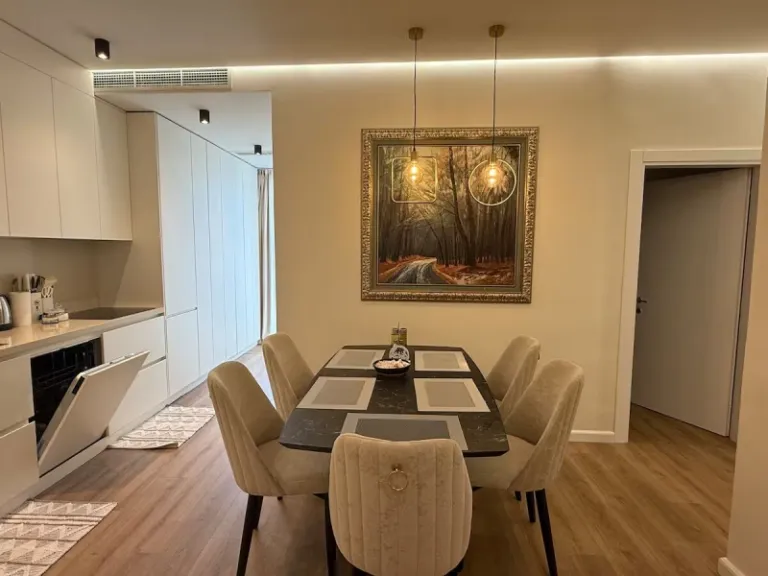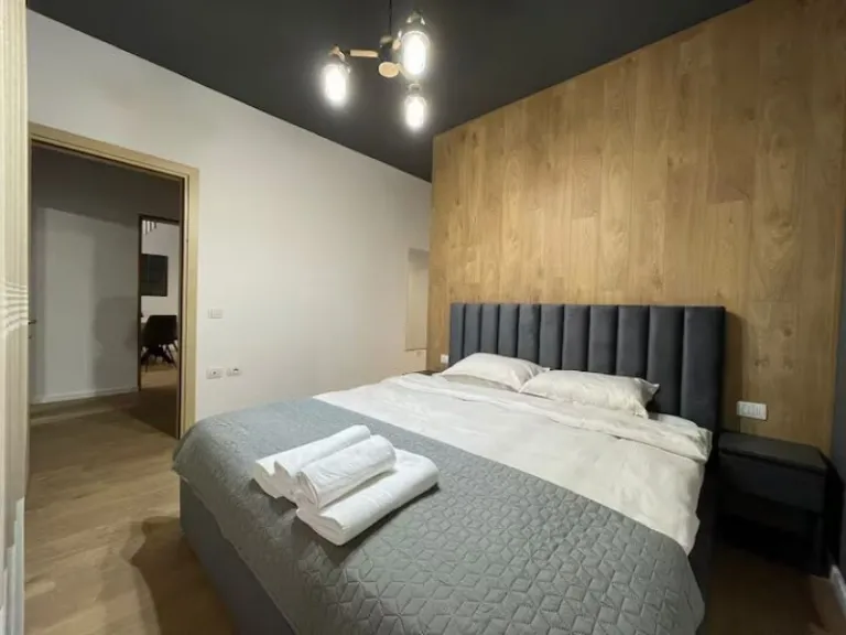 Step into modern elegance with this spacious two-bedroom apartment in the heart of Vlorë. Featuring over hundred m² of living space, stylish minimalist furniture, and two sleek bathrooms – one with a bathtub – this home is ideal for families or groups. You’re just a five-minute walk from the beach and Vlora’s main port, with all the city’s conveniences right outside your door.