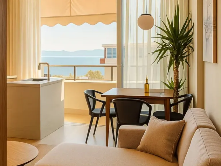 Just fifty meters from the beach, Tila’s Apartment is a thoughtfully designed space offering panoramic sea views from a flower-lined balcony. Inside, the open-plan living area includes a functional kitchen and workspace, while the stylish bathroom and soft furnishings ensure comfort throughout. The adaptable balcony design makes it perfect for year-round enjoyment.