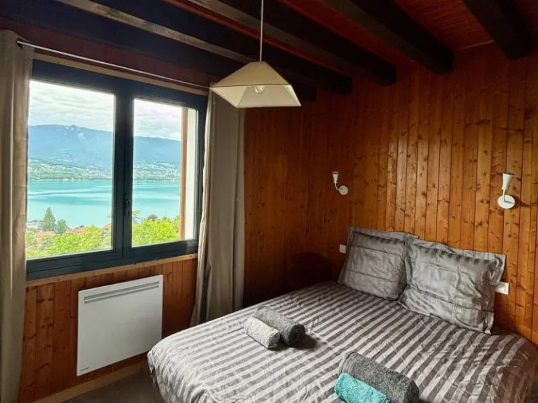 Perched in a 9,500 m² private park, this secluded chalet boasts some of the region’s most spectacular lake and mountain views. Renovated with care, it features three bedrooms, a bright living room, and a large terrace where you can soak up the beauty of the bay of Talloires. Guests can make use of two paddleboards and a kayak, while nearby hiking trails and beaches are just a stroll away. For those seeking peace and privacy, this is one of the Airbnbs in Annecy that is a dream come true.