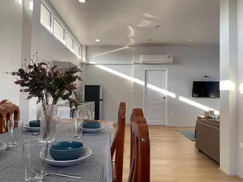 Located in the very heart of Chiang Rai, Prod Place offers the perfect urban base for exploring the city’s cultural treasures. This two-story modern home features spacious bedrooms, ensuite bathrooms, and a fully equipped kitchen. Hand-crafted furniture and local art add a personal touch, while markets and temples are just minutes away on foot. Designed for ease and style, it’s one of the most comfortable Airbnbs in Chiang Rai for families or small groups.