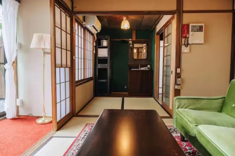 Tucked away in a quiet neighborhood, this newly opened home recreates the romantic Taisho-era ambiance with antique lamps and vintage décor. The highlight is the private garden, where guests can sit beneath soft lights and listen to the gentle sound of water at dusk. Inside, the house features tatami rooms, sliding doors, and air-conditioned comfort. It is one of the ideal airbnbs in Kanazawa for travelers eager to experience traditional Japanese living while remaining close to major cultural sites.