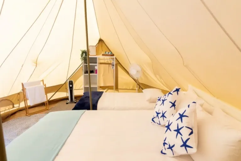 This luxury glamping tent Airbnb is ideal for families, offering a queen bed, one or two singles, indoor and outdoor seating, power, and lighting. Cutlery, crockery, glasses, and more are provided, along with access to the glampers and outdoor kitchens so that you don’t miss your favourite homemade food!