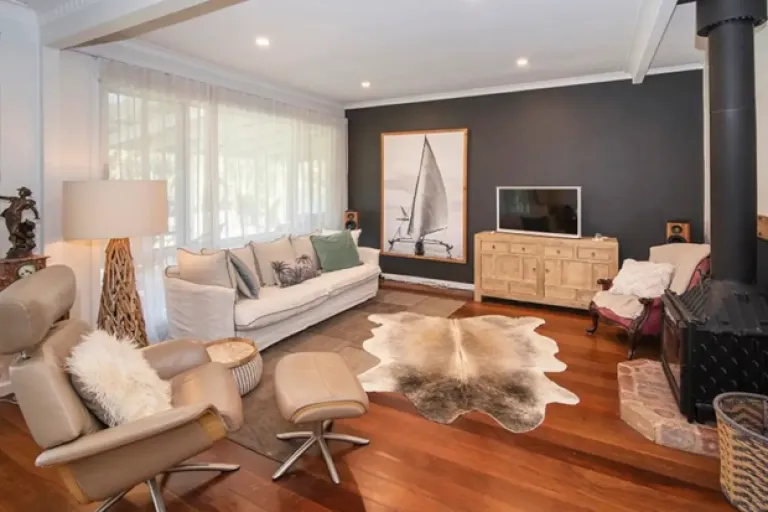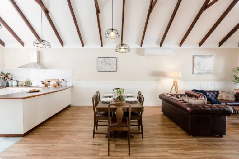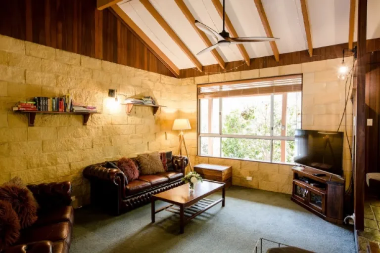 Step inside this Airbnb near Margaret River town centre to discover an exquisitely designed interior, featuring three cosy bedrooms and a spacious open-plan living area. The cathedral ceiling and slate floor add a touch of rustic elegance, while the wood fire creates a warm and inviting atmosphere.