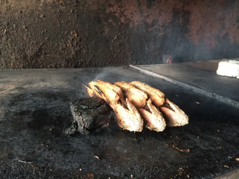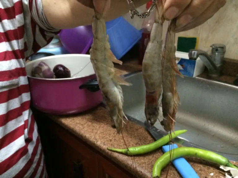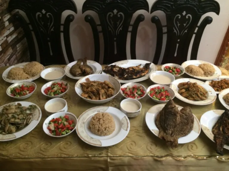 When the food was ready, the three of us guests sat one side, and Islam, Anas, and Malek sat on the opposite side. We feasted on grilled fish, fried fish, steamed shells, savoury shrimps, and dips and sauces and salads.