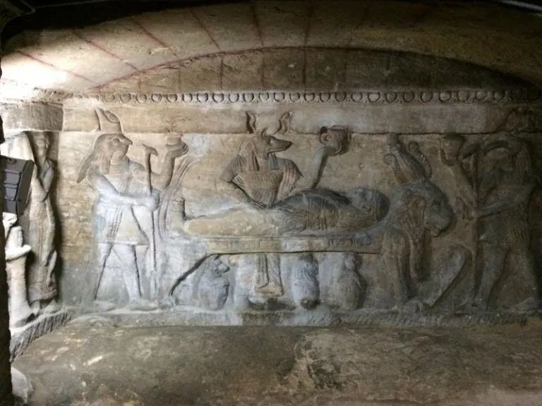 Kom El Shokafa literally means “Mound of Shards,” its name referring to the heaps of broken pottery on site when it was first discovered. Way back when the Catacombs’ departed residents still had living relatives who visited them, the visitors would bring food and drink to “share” with the dead.