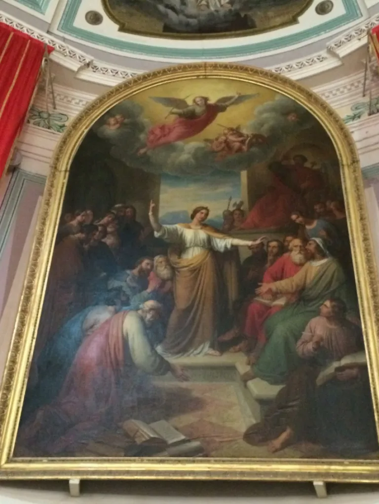 A 19th century painting of Saint Catherine of Alexandria depicted as a divinely-inspired scholar who debated with her pagan opponents.