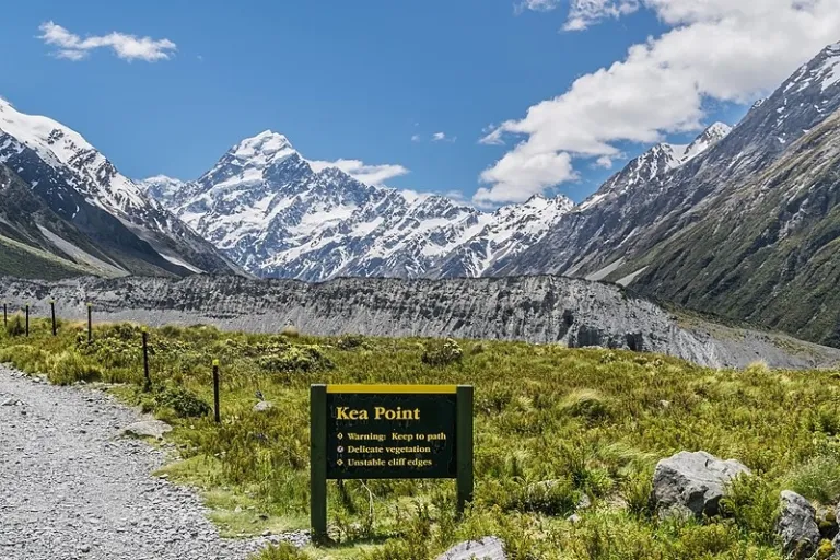 An easy hike, the Kea Point Walk winds along a subalpine grassland to the Mueller Glacier moraine wall. It ends with a lookout to several alpine mountains, including Mount Cook.