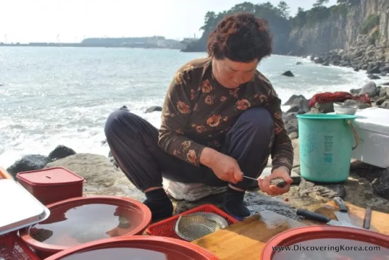 To understand the importance of seafood in Jeju, we all need a little history lesson. Some of the most respected members of the community are the haenyeo, or women sea divers. For centuries, these Jejunese women have provided for the family and community, diving up to 20 metres into the sea to gather shellfish and seaweed. All this without any breathing aids!