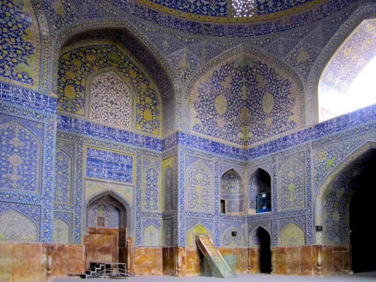 As you enter the building’s interior, be surprised by a kaleidoscope of colours that dance around on the floor, walls, and the ceilings of the mosque! The coloured artistry of the Nasir ol Molk mosque is influenced by the Ottomans, a powerful Turkish Empire and pioneers of Iznik pottery.